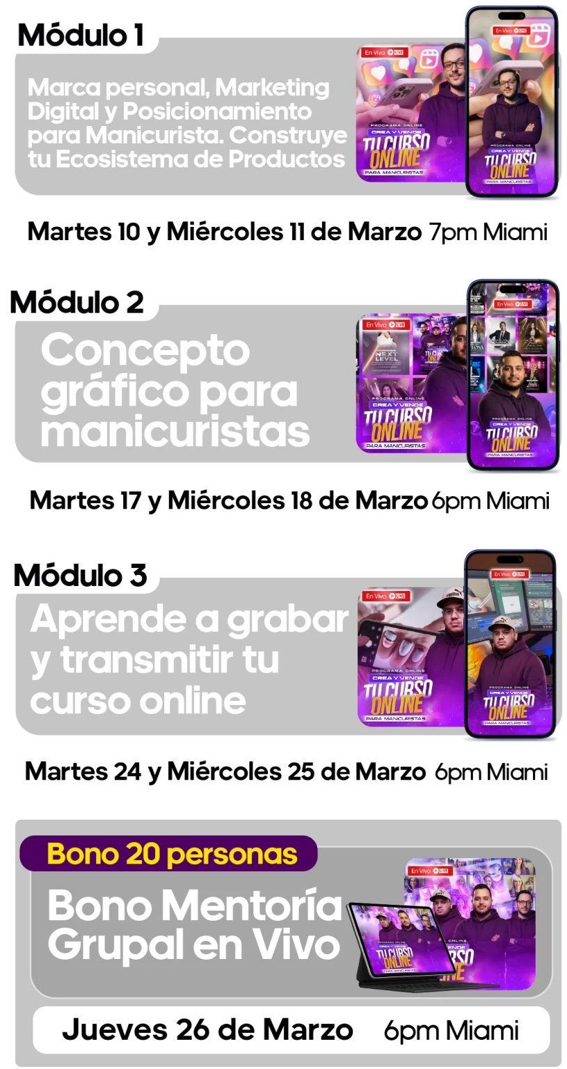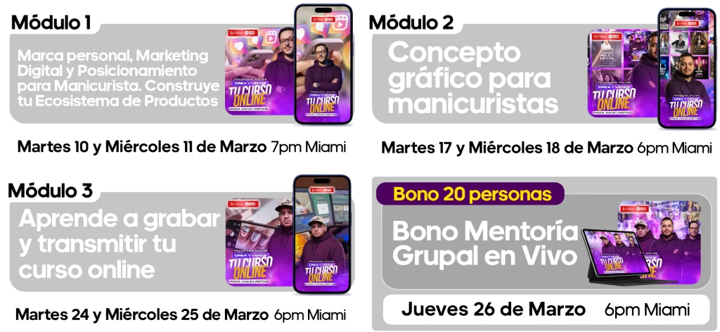 Aprenderás a construir tu marca personal, diseñar y grabar tu curso online, y lanzar tu programa con estrategias de marketing y venta que realmente funcionan.